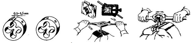+ Tay thuận cầm lấy bàn ren tại ổ kẹp của tay quay đặt vào đầu trục, và ấn nhẹ bàn ren xuống đầu trục rồi quay theo chiều vặn vào của ren sao cho bàn ren cắt vào trục khoảng 1 – 2 ren.